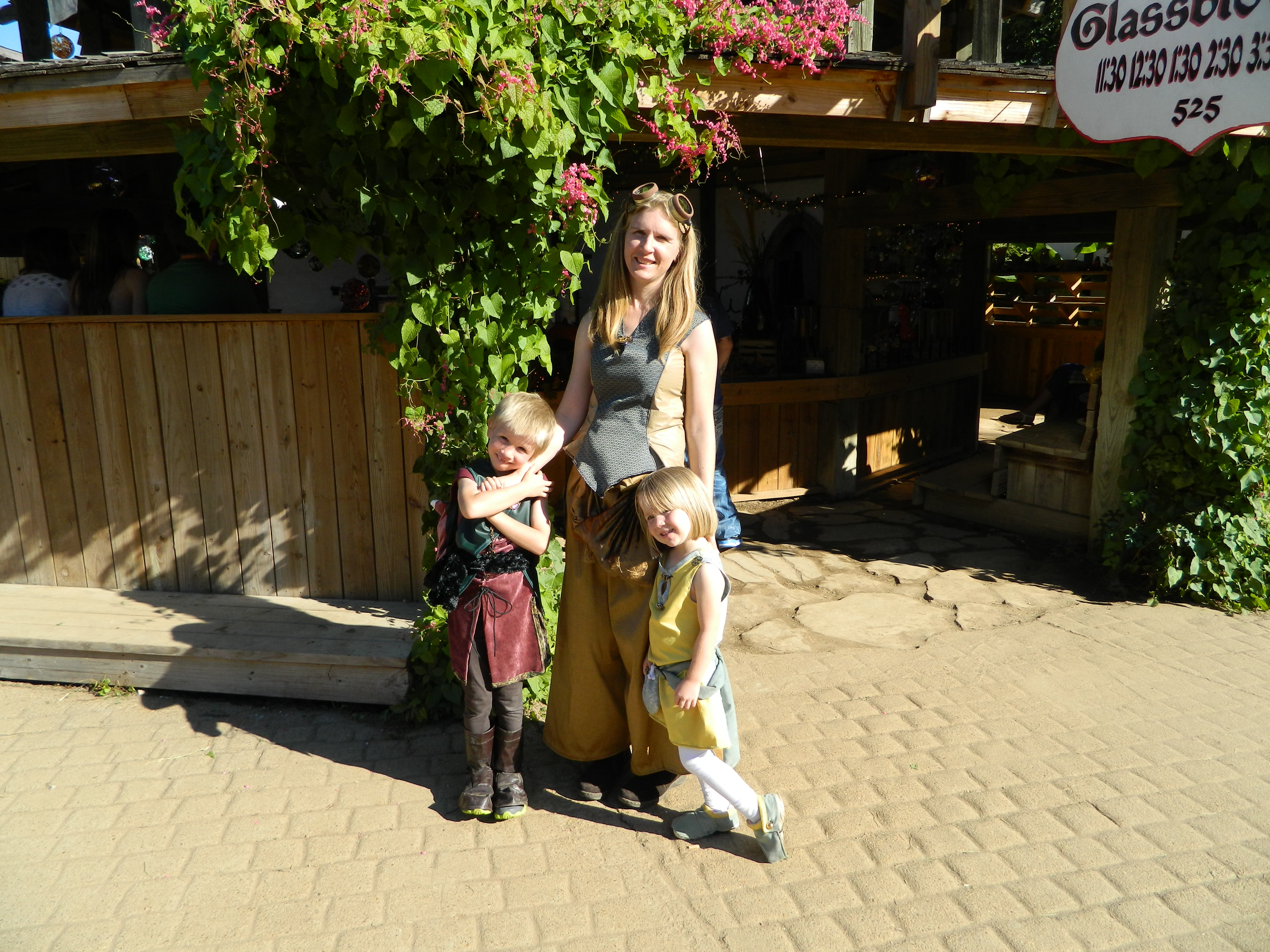 A dragon riding instructor and her two prize pupils at a glass blower’s shop (costumes and photo by E.G.D.)
