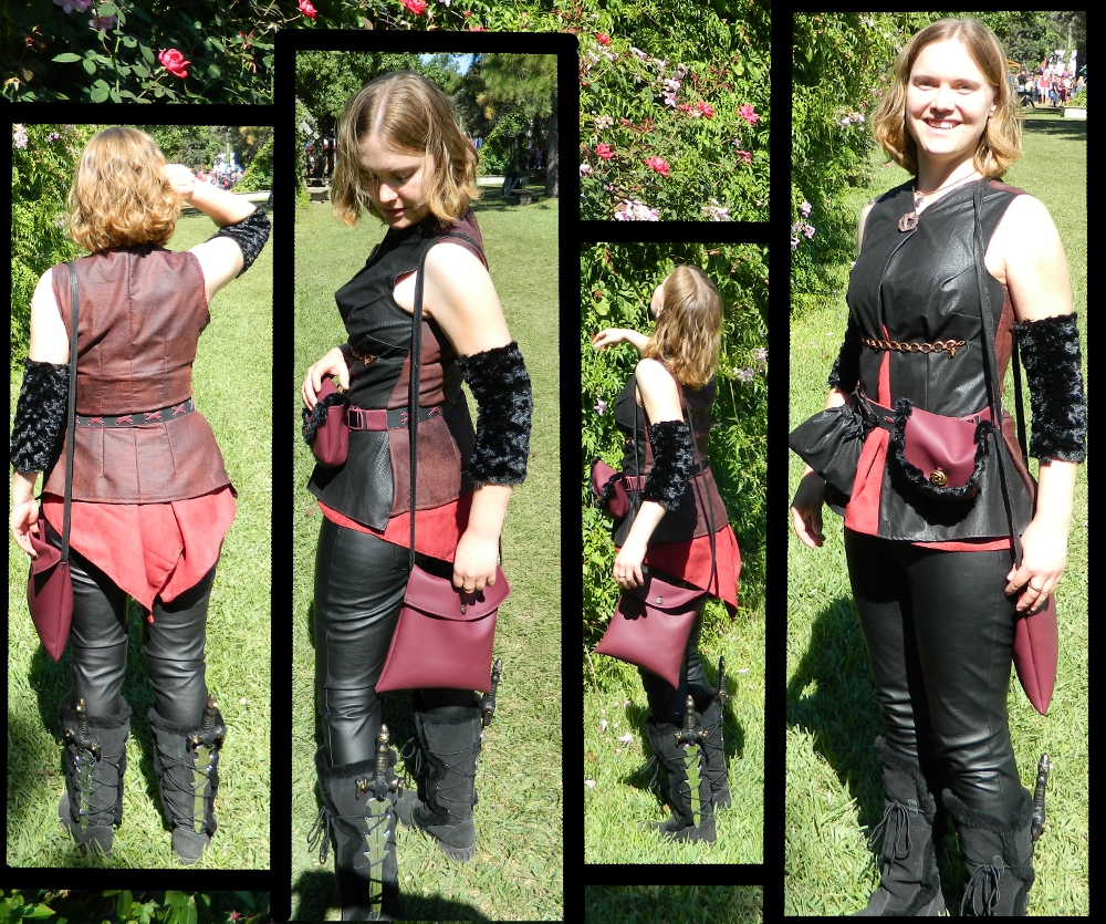 As you can see, due to the nature of my dragon rider job, I have quite a lot of storage associated with my costume. I actually had a wooden box (that I stained by hand with tea, incidentally) that contained a full sewing kit and first aid kit, which I tucked into the burgundy pouch on my belt along with a hand-sewn wallet fashioned from the same fake-black-alligator pattern fabric as the front of my costume vest and my secondary belt pouch. The boot-daggers I embellished by hand, as I did with all the weapons for last year’s Ren Fest. This costume’s daggers are not really weapons as such, but are more intended as tools in case I need to cut a person in need free from a stirrup or some-such obstruction. The large bag was a super-last-minute addition I crafted the night before… when I realized I didn’t have any suitably sized bag for my rather large camera or for the fake-fur half-cape I made for evening outer-wear (and oh, it did get awfully chilly! I was glad I made that cape… though I just realized I didn’t take any pictures in the late evening when I was wearing it…). In any case, the end result of my excessive accessorizing was that I was ready to save the day, keep myself warm, take pictures, and stow away purchases with ease and comfort. This is among the most comfortable costumes I think I have ever made for myself.