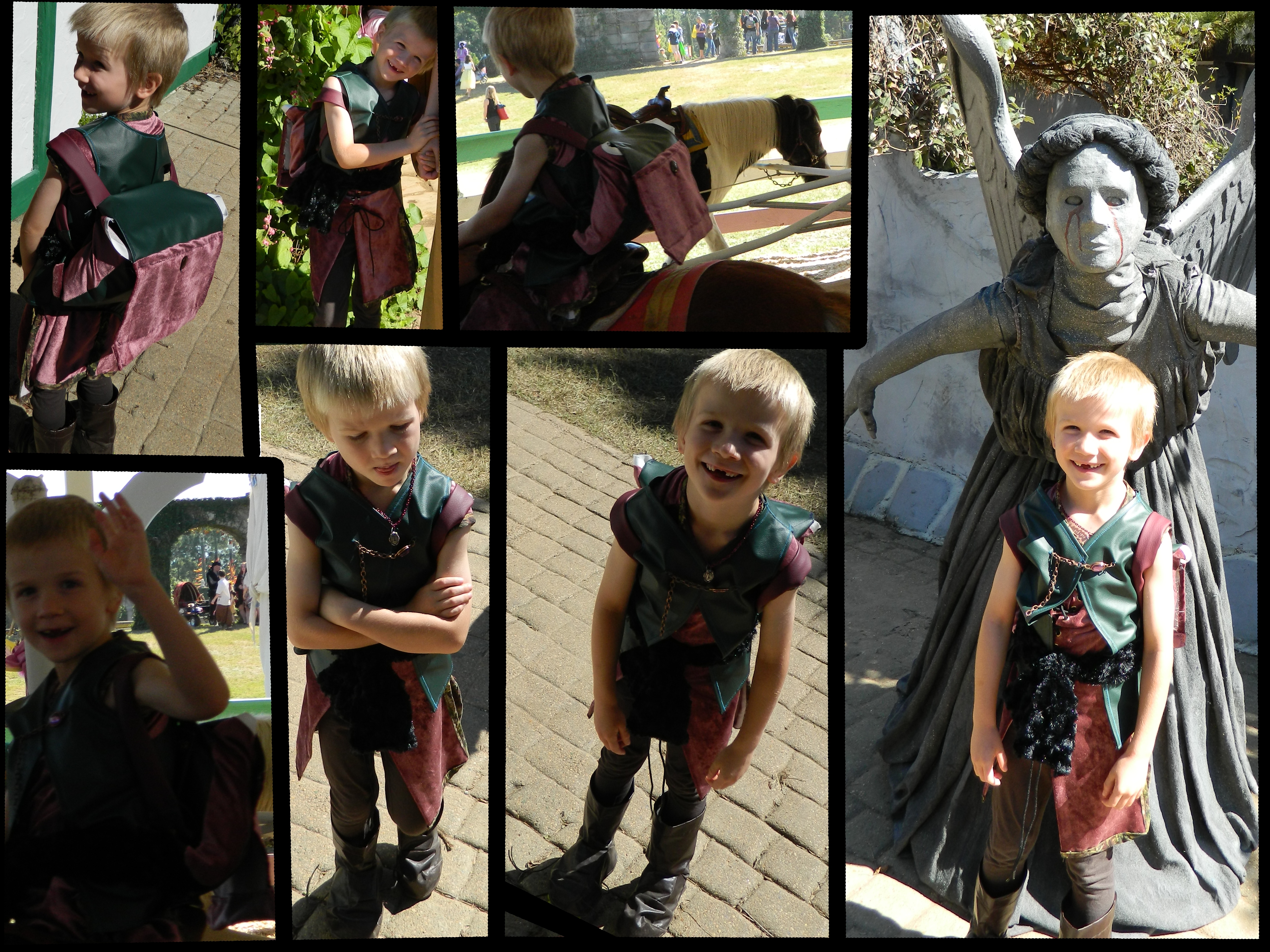 As you can see, he had a sizable book bag. His vest is the boy version of the one I designed for myself, and the book bag actually contains a knee-length, hunter-green, wool-and-polyester felt cloak I made him for evening outerwear. To my mild chagrin, he didn’t wear the cloak, even when it got cold in the evening, so even if I had bothered to take pictures of us all that night, I wouldn’t have a proper picture of it 0_o. I made the straps of the book bag so that they could double in length with the adjustment of four buttons, because I assumed he’d get sick of lugging stuff around and we adults would have to carry it, but he really did carry it around for most of the day all by himself. The cape I made his sister is in the bag, too, as he kindly agreed to carry it for her.