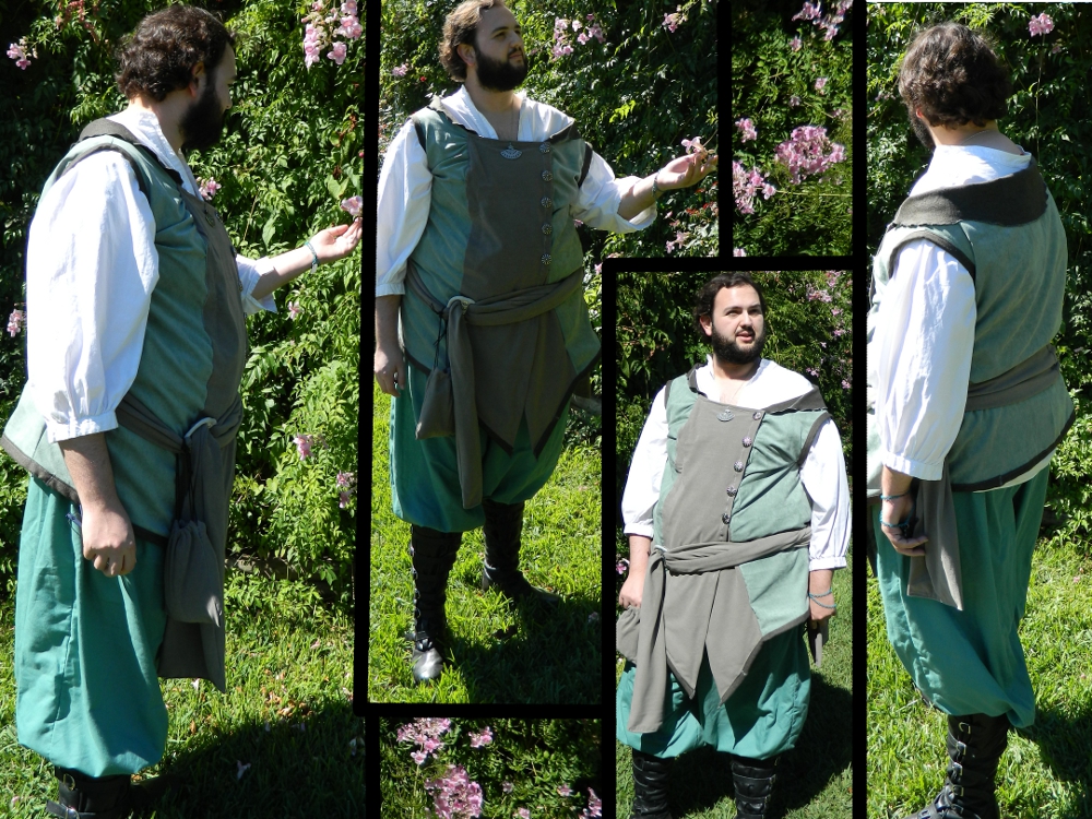 I made the sash buckle by hand out of an epoxy jewelry clay and silver-finish fleur-de-lis buttons. He bought the boots from a cobbler at the actual Ren Fest, incidentally, and I think they made for a quite classy finishing touch! The chain on his wrist held his guild issued dragon riding license (a metal signet-seal monogram of the first letter of his last name. We each had one, though the other four of us wore ours as necklaces).