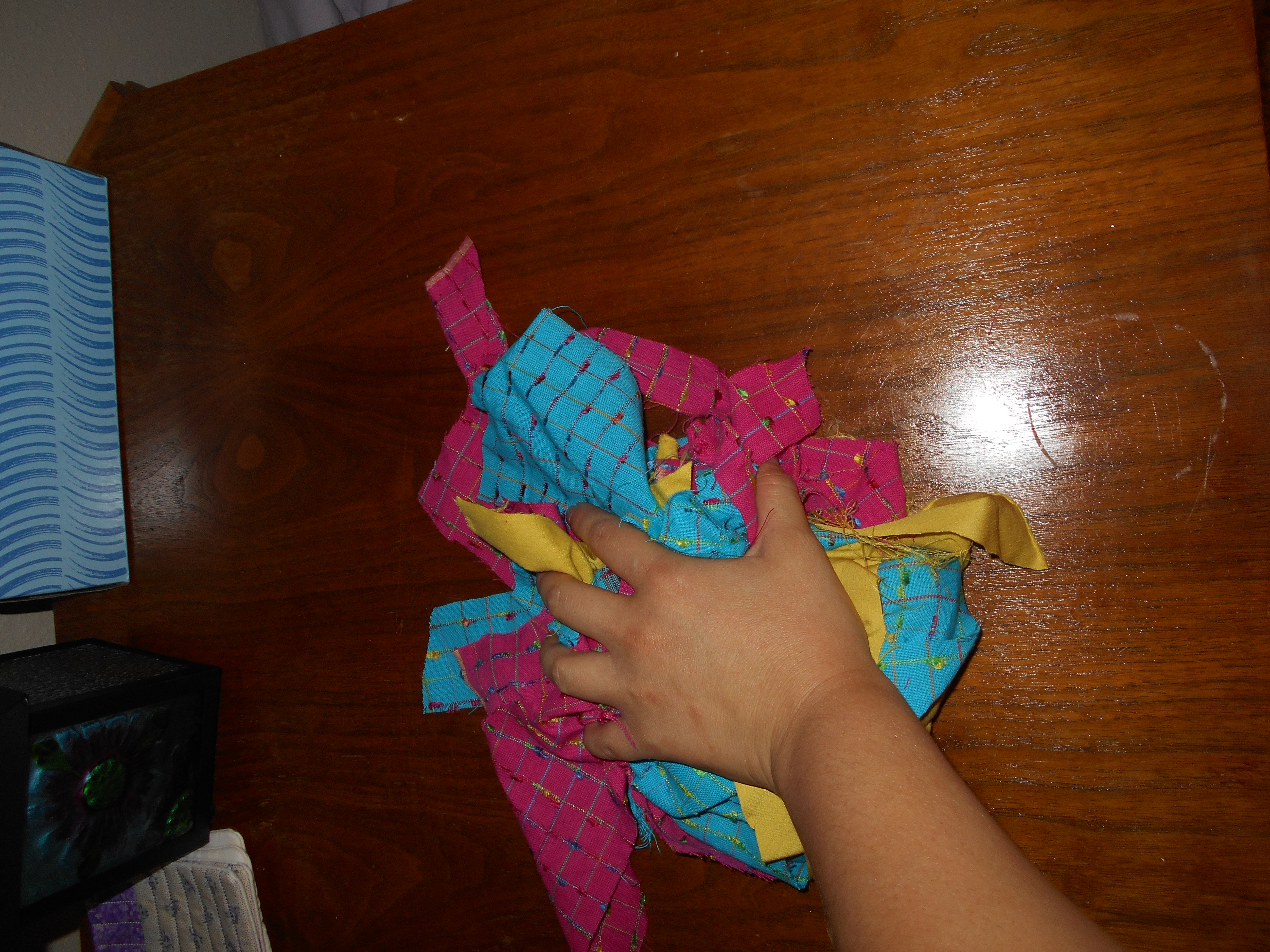 And because I am still amazed I pulled this off, I gathered up the sum total of the scraps left from these fabrics and took a picture of me putting the lump on my coffee table. And yes, all the scraps fit easily into my left hand before I started to let it go: