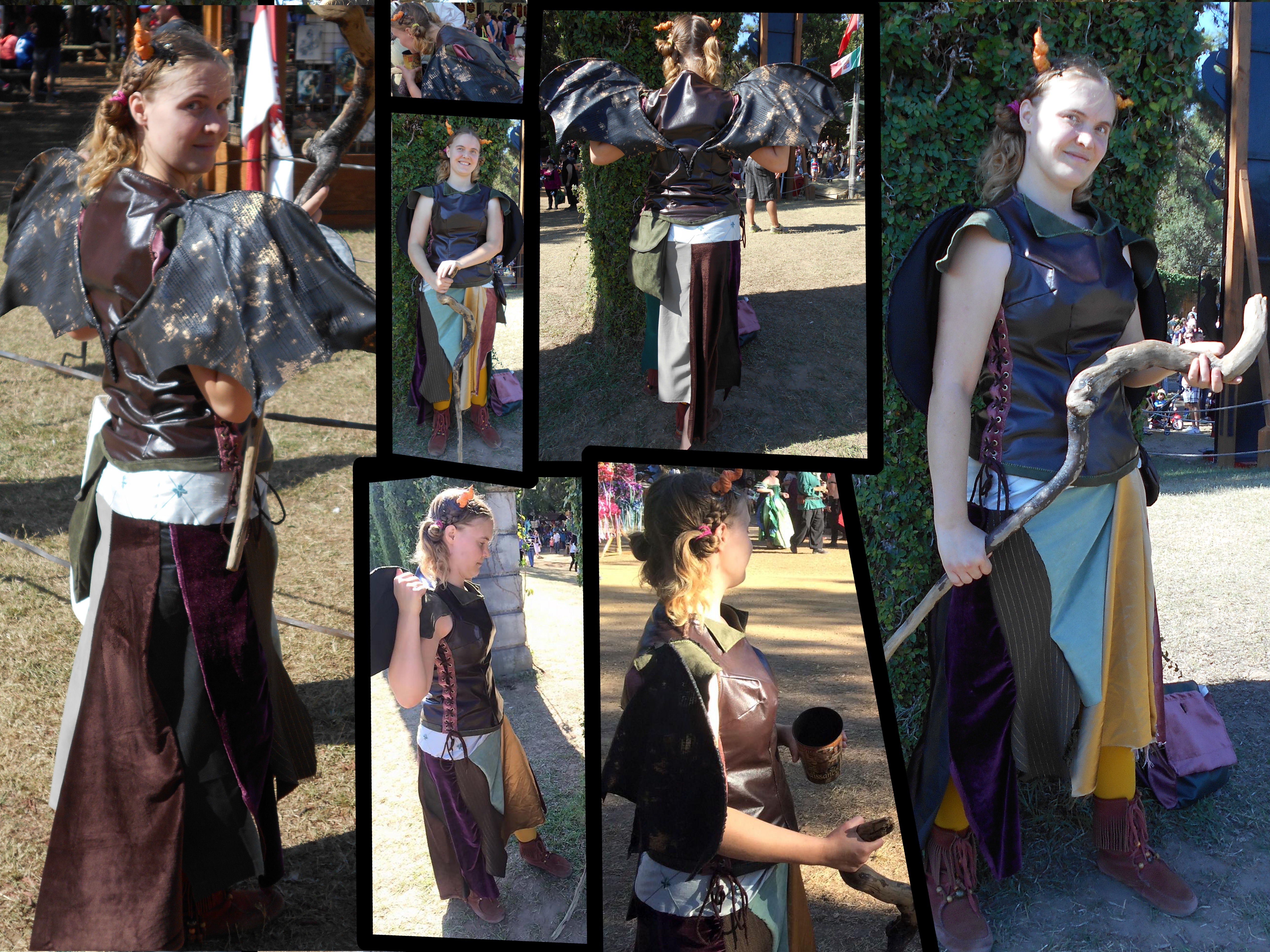 Raggedy Anise is the kind of faerie who is a mix of many things, most of them dangerous, though she is unlikely to harm you unless you do something to get on her bad side (of course, if we’re realistic about this, she’s a faerie, so that isn’t entirely difficult to do). I made the horns from sculpey clay and the wings from floral wire and sort of alligator-skin-ish pattern black and gold fabric. I designed the wings so that they can be either at rest or unfurled, and they provided some great sun shade during the hot part of the day! The cloth bits that make up the skirt are all from my scrap bin, and I left the raggedy and frayed edges at the bottom for that raggedy look. This is actually the third time I’ve revisited the bodice I used. I built it for my ranger costume that first Ren Fest year (though I wore it for Halloween, not the actual Ren Fest, at which I wore my bard costume) and re-worked it for last year’s Robin Hood look. I left it in Robin Hood mode this year and simply added the wings and unfurling mechanism. The boots, I embellished for last year’s costume, but what makes them special to this year’s costume is that the McLin family dog chewed a great big hole in the back of one of them, and I had to patch it up! The fact that the boots are now old and very well-worn, as well as patched, made them ideal for this particular costume. Both the belt pouch and the purse are from last year’s costume, as well. What is probably the most special part of this costume is the walking stick, which I found on Sylvan Beach after a particularly violent storm earlier this year. Driftwood is just so darn cool, and it was a truly special find! It’s also surprisingly lightweight.