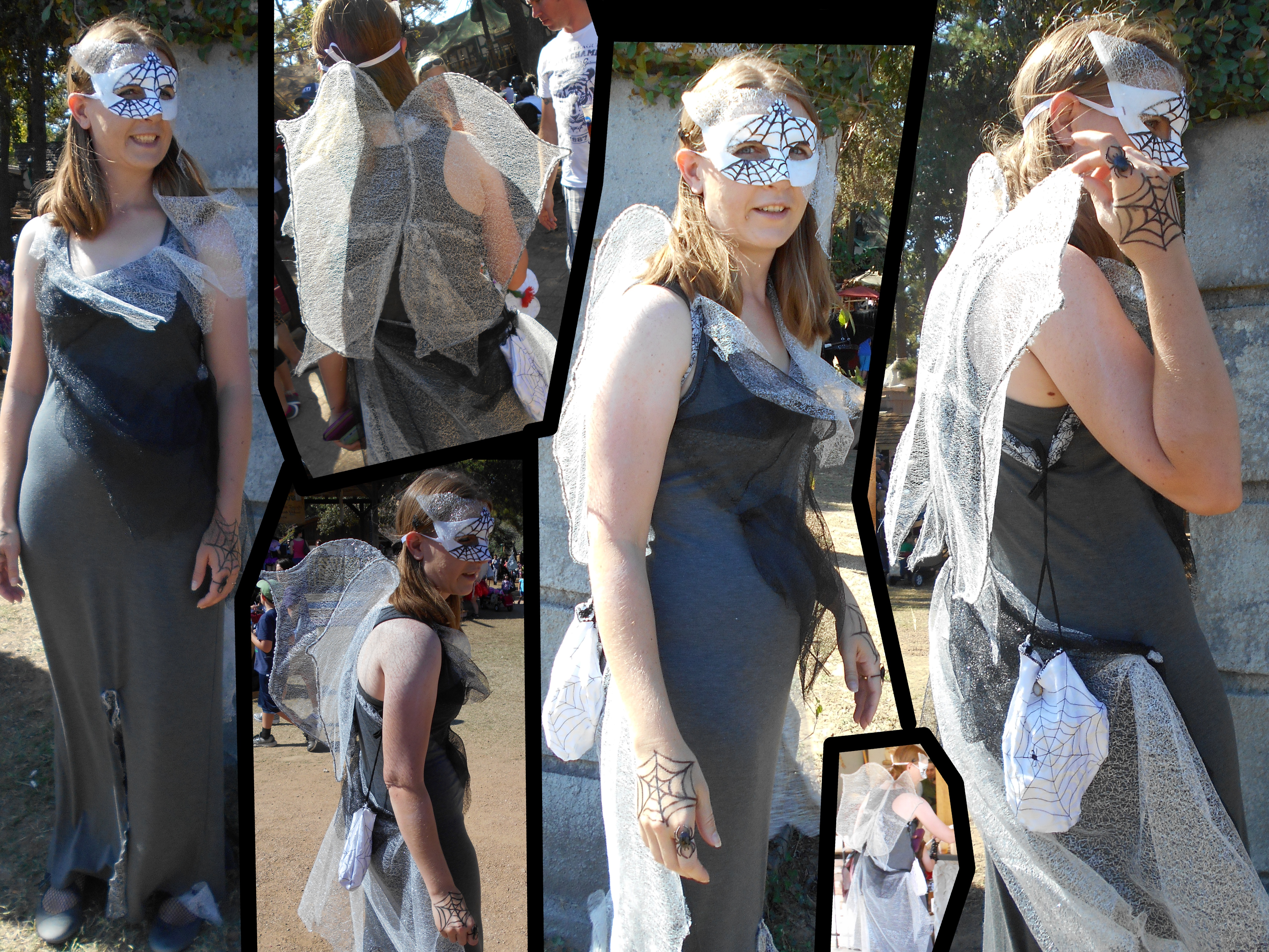 Spider Silk, as you almost certainly already guessed, is a faerie with a strong spider affinity. Her wings are delicate webs of silver, and her dress is draped and gathered with webs of silver and black. The dress also has silver-web inserts at the front and back that flare when she walks, showing off her web-looking fishnet stockings, but I somehow didn’t manage to get a picture that captured that feature well. I embellished the mask with that silver web and black paint, and she decorated the skin of her hands with black eyeliner webs. I embroidered the purse I built for this costume with a web design on both sides. If you look closely, there’s also a little spider ^_^. The harness for the wings is a spider and web patterned scarf I purchased at a halloween store, and the little gem spider rings that are decorating Spider Silk’s hand and hair were purchased at the same 99 Cents Only Store as Daisy’s shirt and scarf. Halloween season is very convenient for this sort of thing!