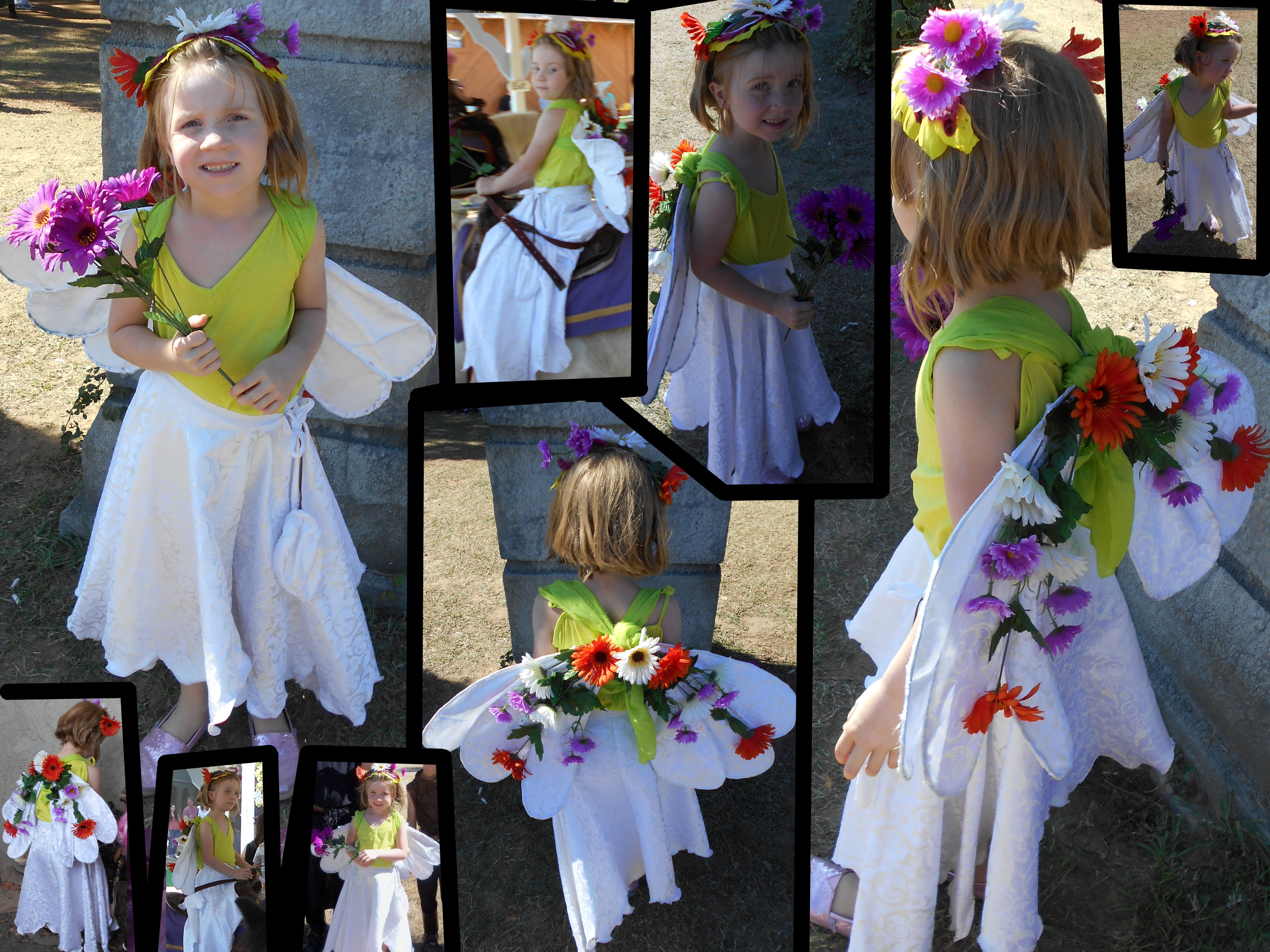 Daisy the Garden Faerie (Oona changed the name from the original, which was just plain ol’ “Daisy”) is a faerie who loves flowers and uses flowers in her magic! Her wings are daisy petals, and so is her skirt and her little purse (all made out of the same very stylish brocade). The headdress is actually a mask, but it wasn’t very practically sized for her little face, when all was said and done. It is made of feathers and plastic daisies (the same plastic daisies with which I embellished the wings). The green shirt and the scarf I used as her wing harness were both purchased at the 99 Cents Only Store in Atascocita. I was going for a flower-being-held-upside-down sort of look, with stem up top and flower drooping down. As a point of interest: I built the skirt so that it can be easily re-sized, and she should be able to wear it well into her teens, should she choose to do so.
