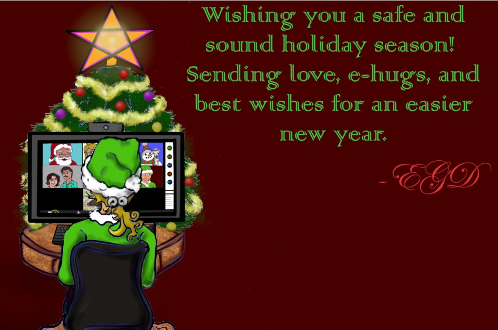 Well, strange as it may seem, it’s that time of year again. It has been a rough year for everyone, but I hope you all manage to find some warmth and joy in the season. This year, I free-handed 6 different images, painted them with GIMP software, and assembled them into, well, what you see below. Sending love to everyone through this crazy internet void. I want to e-hug the world (nice, germ-free e-hugs!).